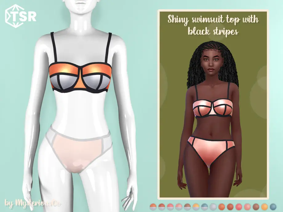 Shiny swimsuit top with black stripes in 15 colors