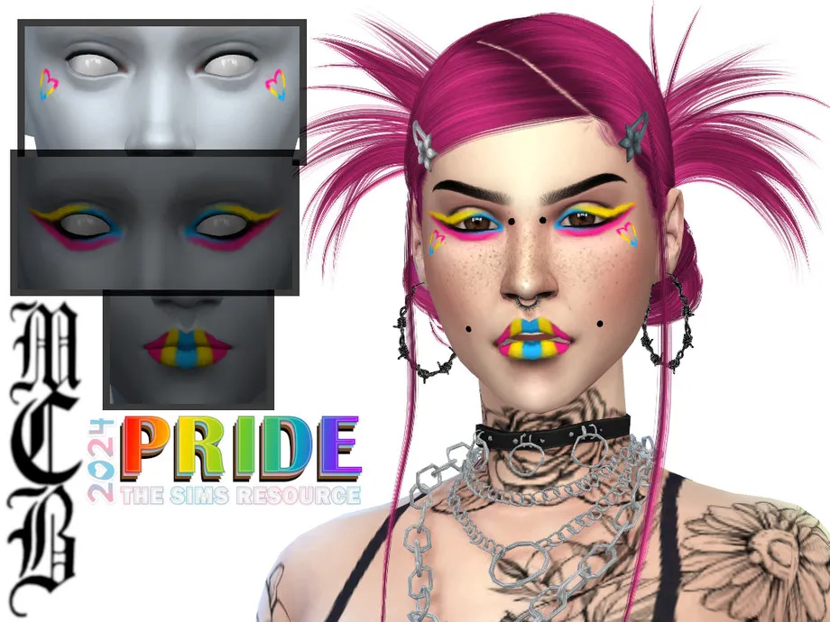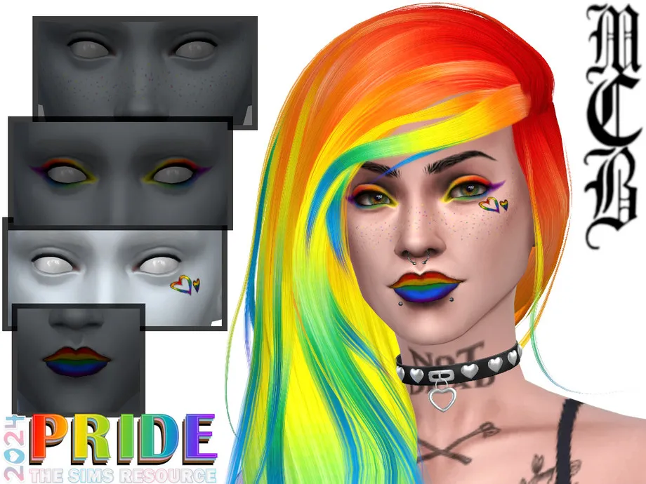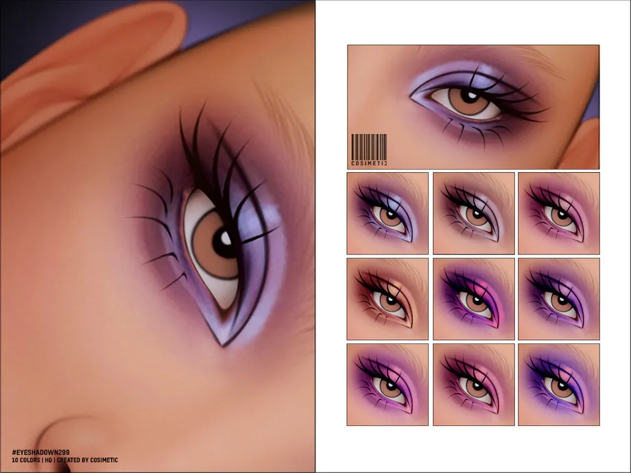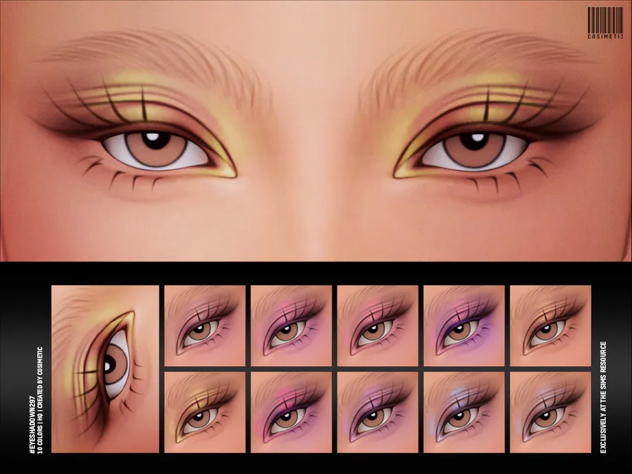 A 9-swatch graphic eyeshadow with bold black eyeliner in 60s colour palette – yellows, oranges, greens, pinks and purples. Eyeshadow is suited from Teens to Elders and all occults apart from werewolves. Created only for females. HQ mod and EA sliders compatible.